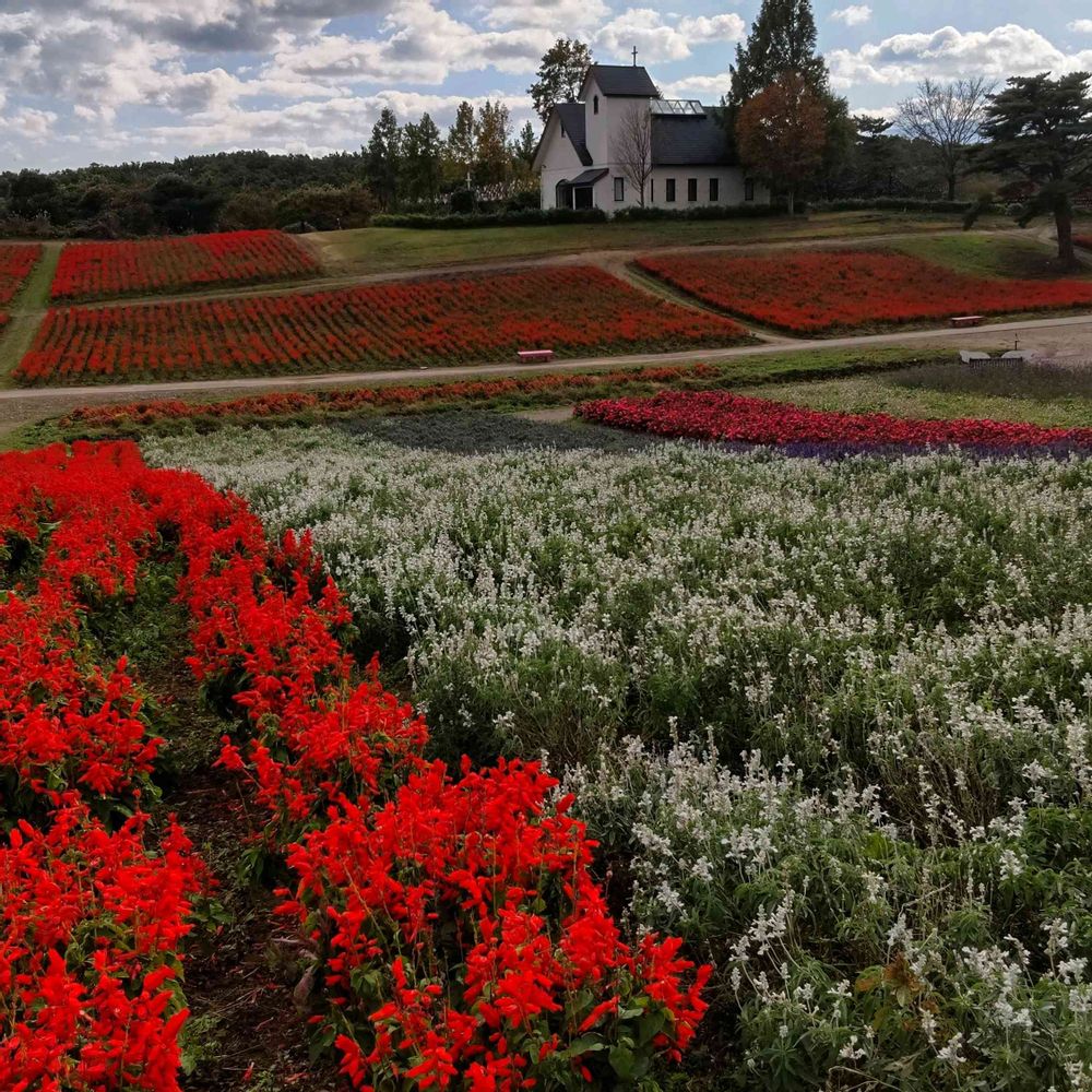 赤はサルビア黄色はマリーゴールド、ブルーはサンジャクバーベナとサルビア、そして秋桜も綺麗🌸青空に映えます🤗