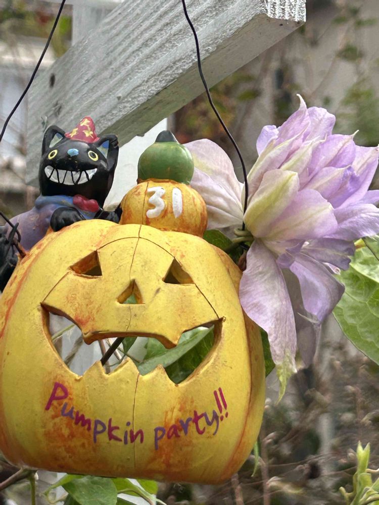ハロウィンの日に、カボチャ🎃に巻き付いて開花してくれました、クレマチスベルオブウォーキング まるでかぼちゃの髪飾りです。