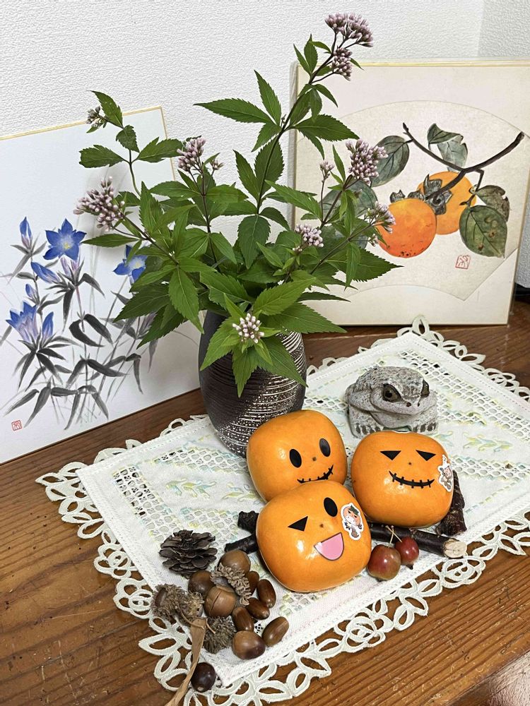 かぼちゃではありませんが🤭スーパーで柿に貼るシールを配っていたので遊んでみました🎶