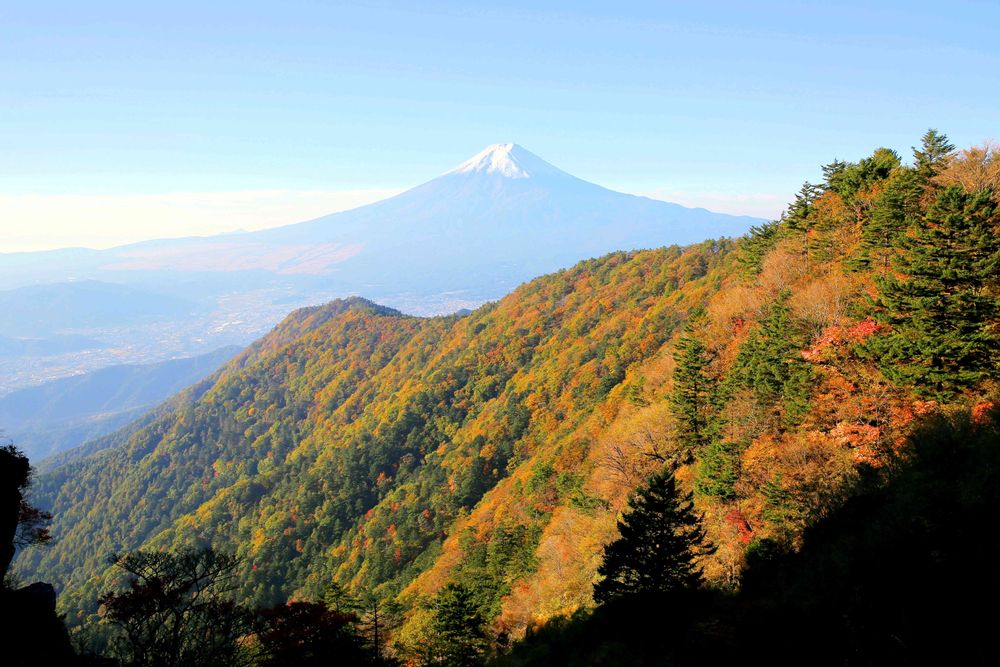 紅葉する山と富士山がとても綺麗でした。