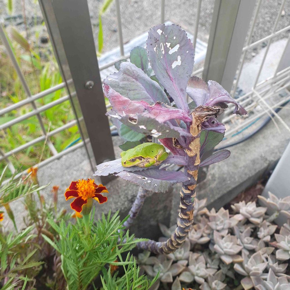 去年のハボタンは ボロボロになりましたが カエルはまだいます。