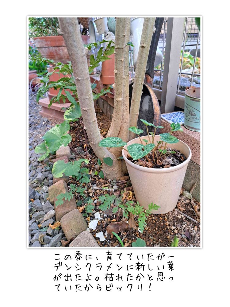 この春に、育てていたガーデンシクラメンの葉が出てきました。