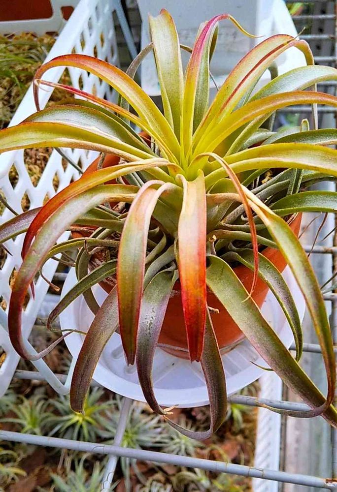初めて外にガラス付きの簡易温室に入れて育て綺麗に色が付いてきましたが他のチランジアは家に入れました😃