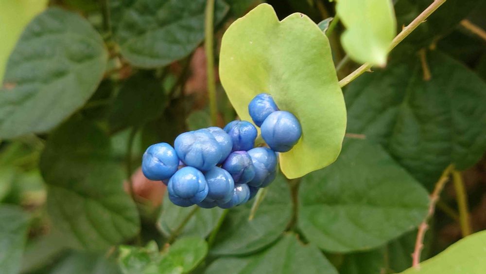 庭のツツジの木に絡まっていました。青い実の根元はハート型の葉で、実のついていないツルの部分は、三角形の葉っぱでした。名前は何でしょう?