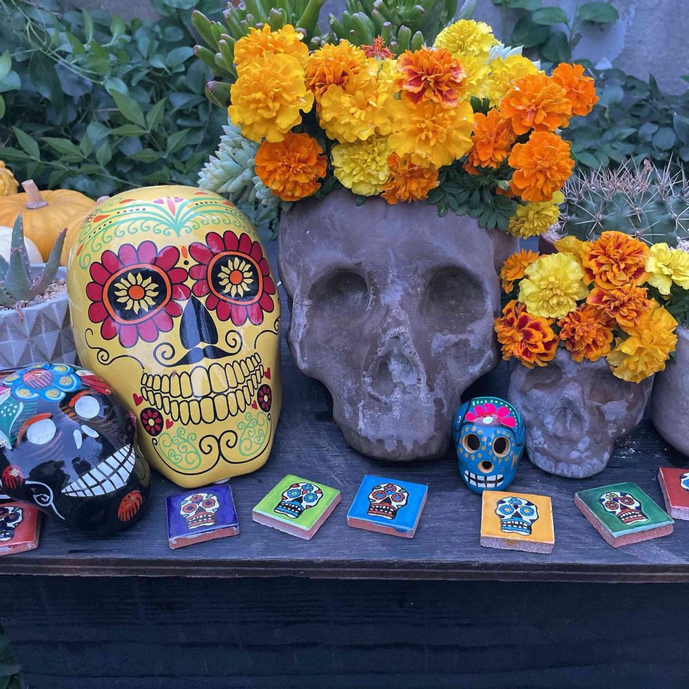 スカル鉢の多肉植物にマリーゴールドを寄せ植え。