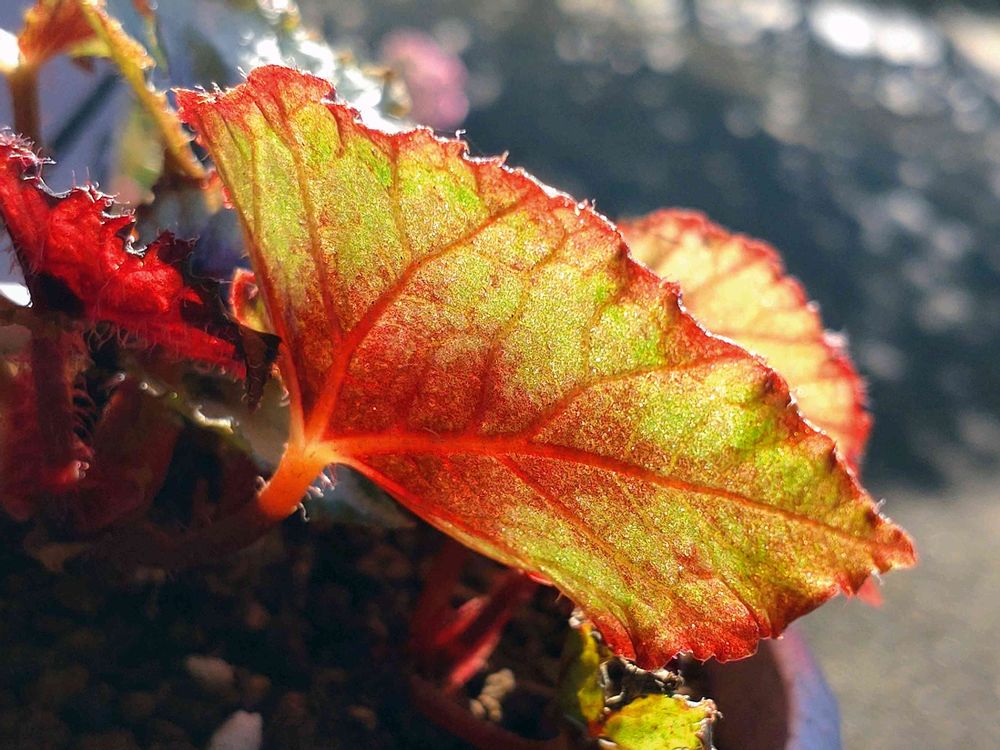 ステンドグラス、5月に頂いたときは真っ赤👀💓夏にちょっと傷めちゃったから…葉っぱ再生途中なの〜💦キラキラ✨光に透ける感じはまさにステンドグラス〜🥰