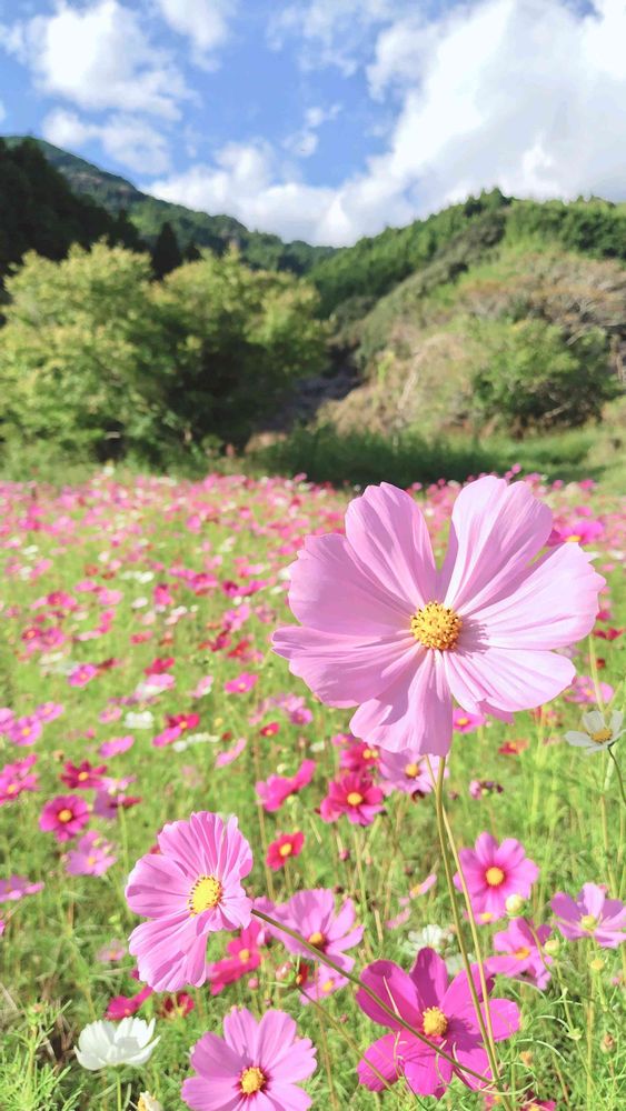 青い空と山⛰️その手前にはコスモス畑