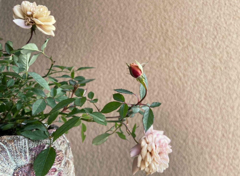 バラの色が派手じゃないところが鉢の良さを引き立ててるね😊