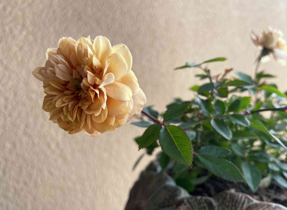 そんでもって豪華だけど落ち着いた感じの鉢がバラの可愛らしさを引き立ててるわ👍