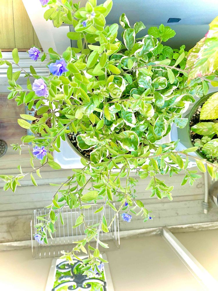 アメリカンブルー、まばらにですがポツポツと咲いて,隣の斑入りハイビスカス🌺も、ミニバラ🌹白🤍とピンク🩷,おまけにペパーミントも、と、室外機の上にひしめき合っています💦😅
