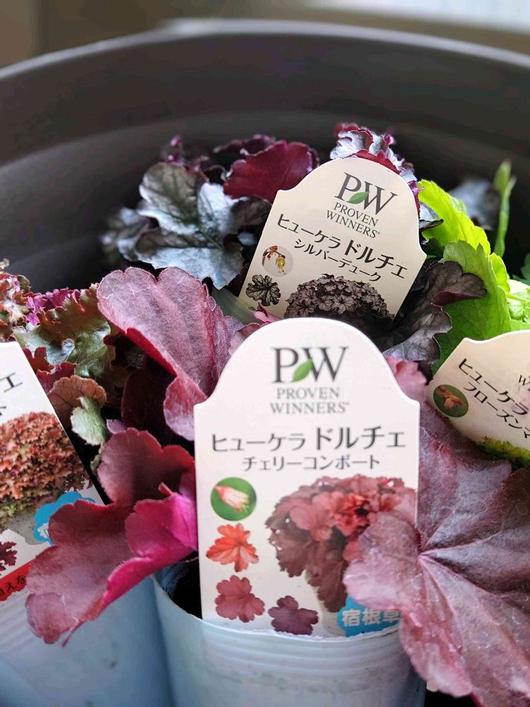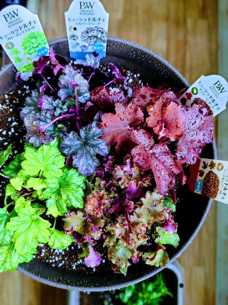 昨夜会社帰り、ふら〜っと立ち寄った最寄りの園芸店でヒューケラドルチェに遭遇!憧れの苗に出会えてテンション上がりました!4種をお迎えして、さっそく寄植えに。