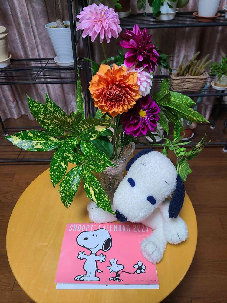 先日秋田国際ダリア園で買ったダリアとスヌーピーグッズでアレンジ🐶🐾🌟💖