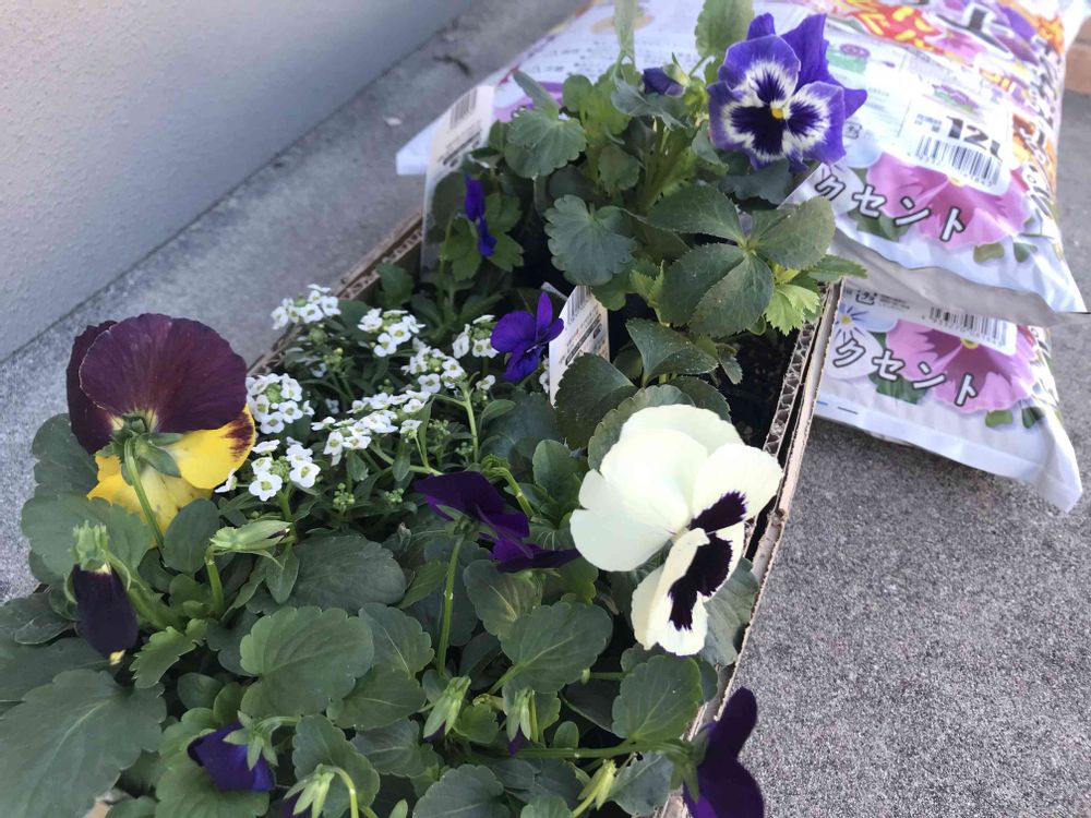 こんなパンジーも植えました。奥はパンジー・ビオラ用の培養土です。