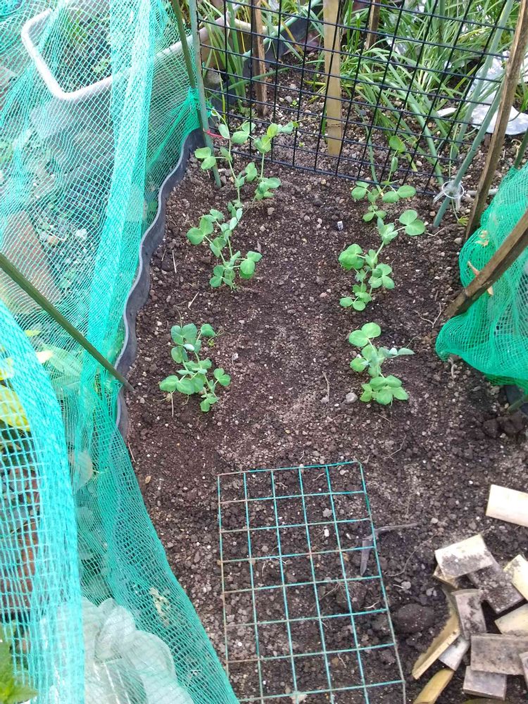 ポットで育てていた紫えんどうと花心白菜を畑に植え付け。