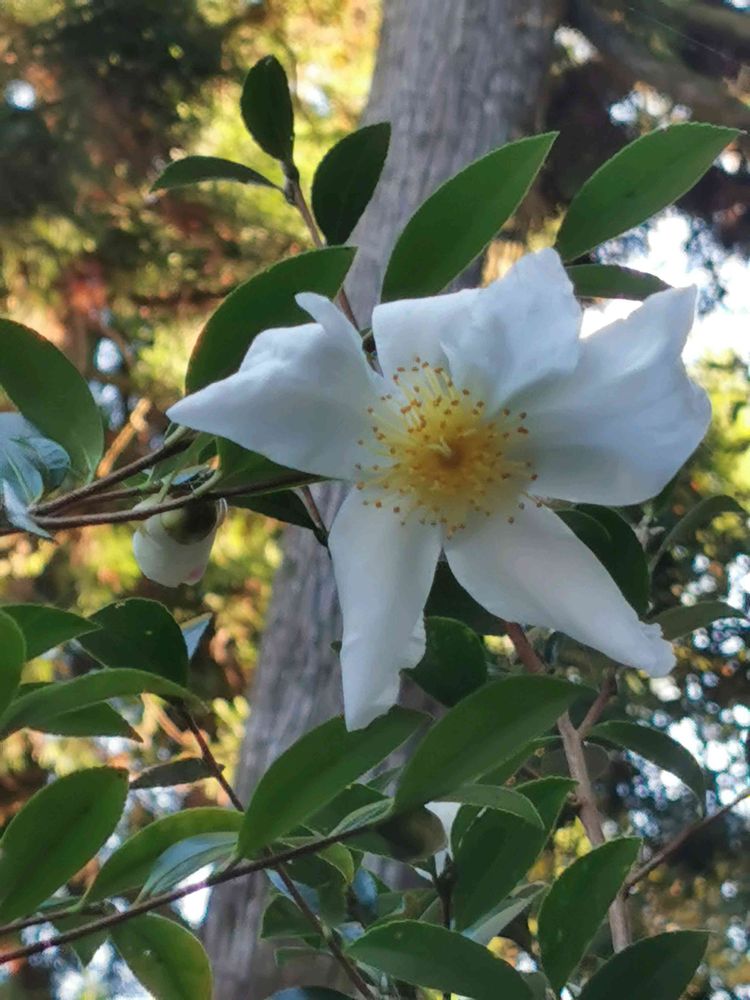 足もとに白い花びらが落ちていたので、上を見たら、サザンカが咲いていました。🌸🌳⛩️