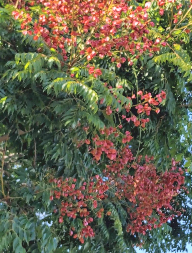 何?? 花かなと思ったけど、黄色い花はあっと言う間に咲き終わり、ピンク色の紙質の果皮がシャンデリアのようについているので遠くから見ると花のように見えた