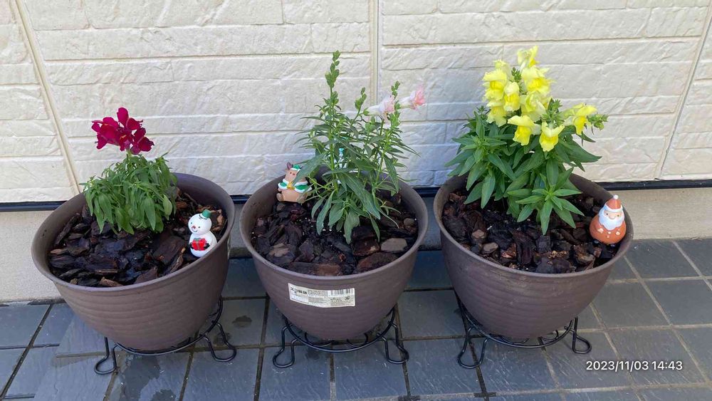すでに横長プランターに植え付けていた金魚草も丸鉢に植え替えて、これで色違いの金魚草が3つになりました😃