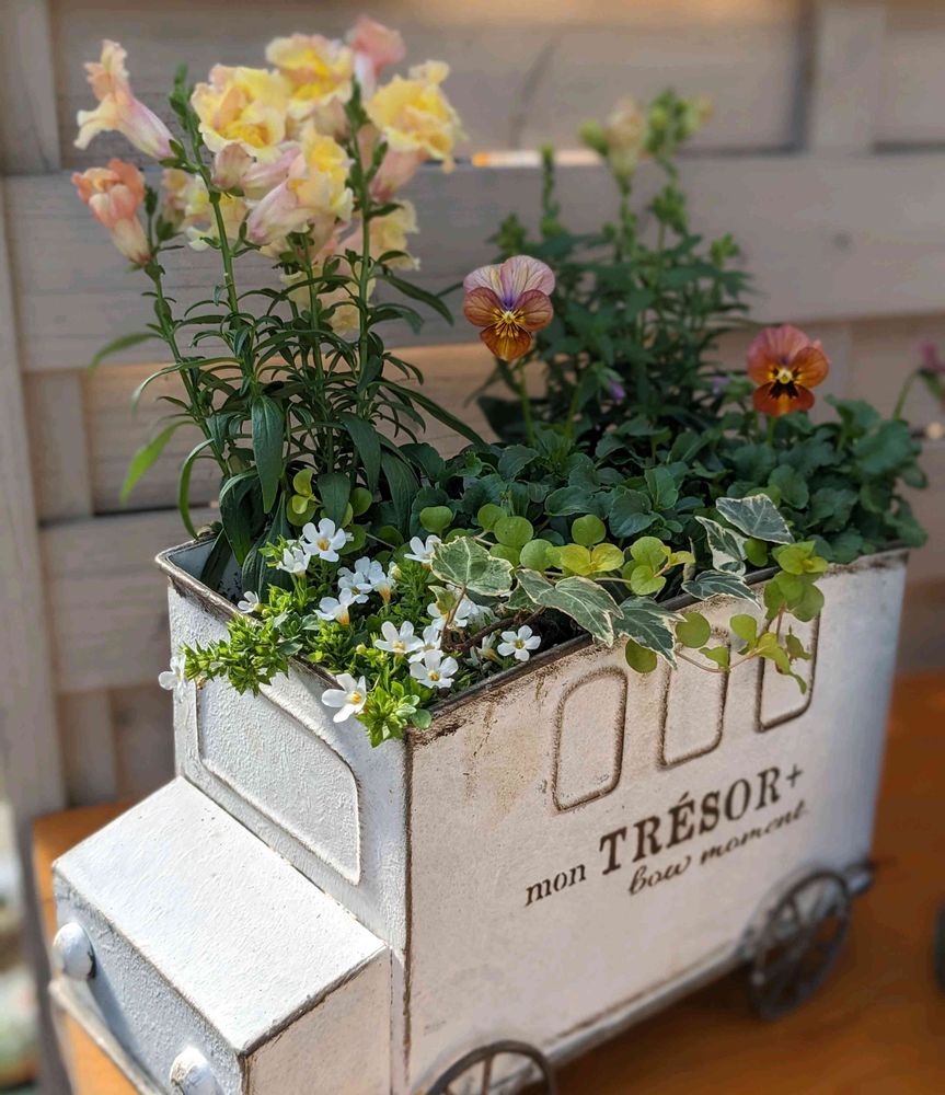 車の鉢は誕生日に娘が買ってくれたものです。やっと寄せ植えできて娘に見せたらかわいいって喜んでくれました☺️