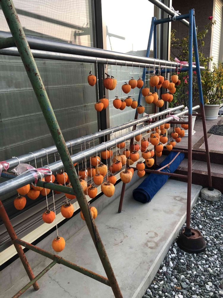 #吊るし柿 今年も去年に習って、皮を剥いた後、熱湯消毒をしてから、吊るしました。美味しい柿になぁーれ🤤