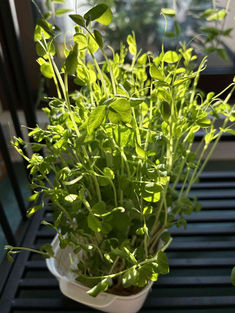 刈り取った豆苗を水耕栽培。場所をアチコチ検討した結果、午前中に陽の入る室内の窓辺がお気に入り😍のようです。育ち過ぎたので今日こそ食べなくちゃ(*^^*)3度行けるかな😋