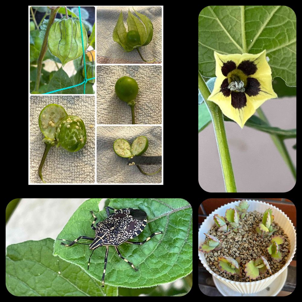 おはようございます。晴れ、17.4℃、9:00爽やか・ちょうどいい。食用ホオヅキ、なかなか実が熟さないので、採って解体、種もあり、ナス科なので味は少し酸っぱい、早く黄色く熟さないかなぁ〜、葉っぱに虫が、、Googleで調べたらキマダラカメムシでした。子宝弁慶草の子たちを植え直ししました。🥰😍😻😋😸☺️