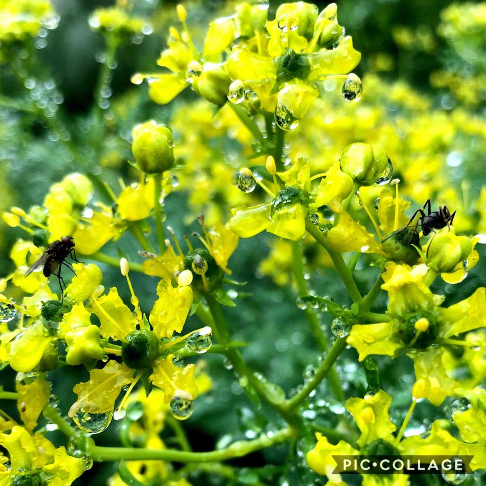 「雨が降ったらポンポロロン、雨が降ったらピッチャンチャン🎶」絵本の「おじさんのかさ」のフレーズは、花の上で雨宿りしているアブとアリも、口ずさんでいそうです💕