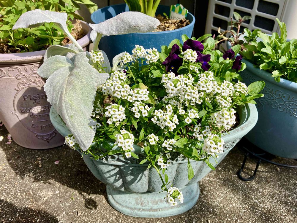 アリッサムとビオラ、セネシオで簡単な寄せ植えを作りました♪