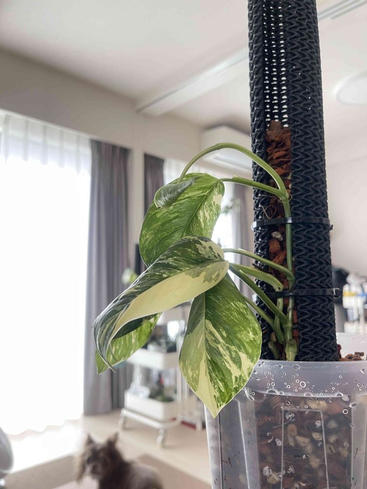 先日お迎えした子を、ねこチップ、ねこの登り棒、ネガミエルに植え替えました。葉っぱは勿体無いけど6枚落としました。