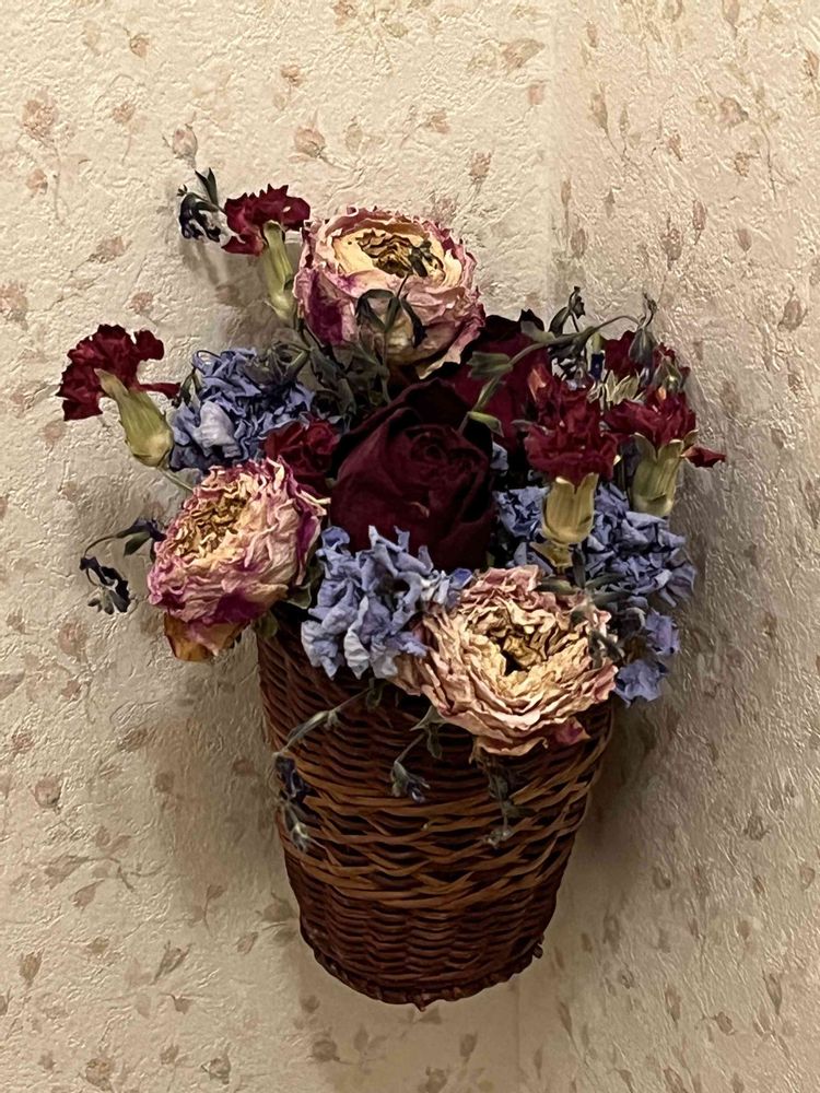 我が家で咲いたバラやブルーノート、アジサイをドライにして飾ってみました カーネーションは花屋さんから