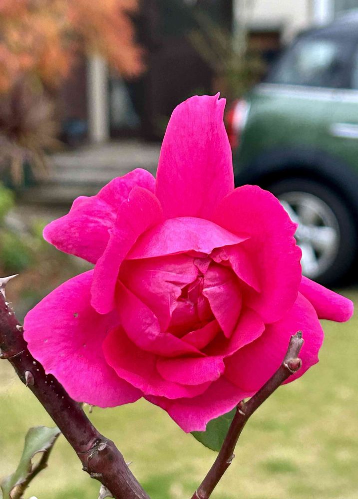 今朝の庭pic。寒くなってきたけど,つるバラパレード元気に咲きました。バッグ左側にはしだれ紅葉です🍁🍁。