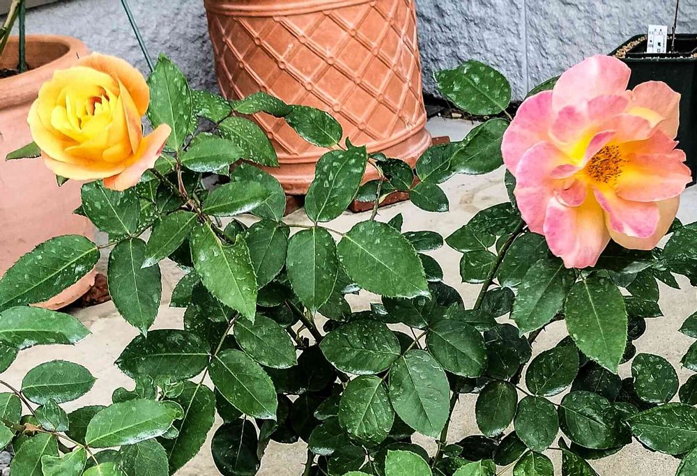 この写真に写っているのは、どちらも「アンネの思い出」というバラです。このバラには、咲き始めから終わりにかけて次第に花弁の色が変化するという特徴があります。このオレンジからピンクへの色の変化も魅力のうちの1つです😄