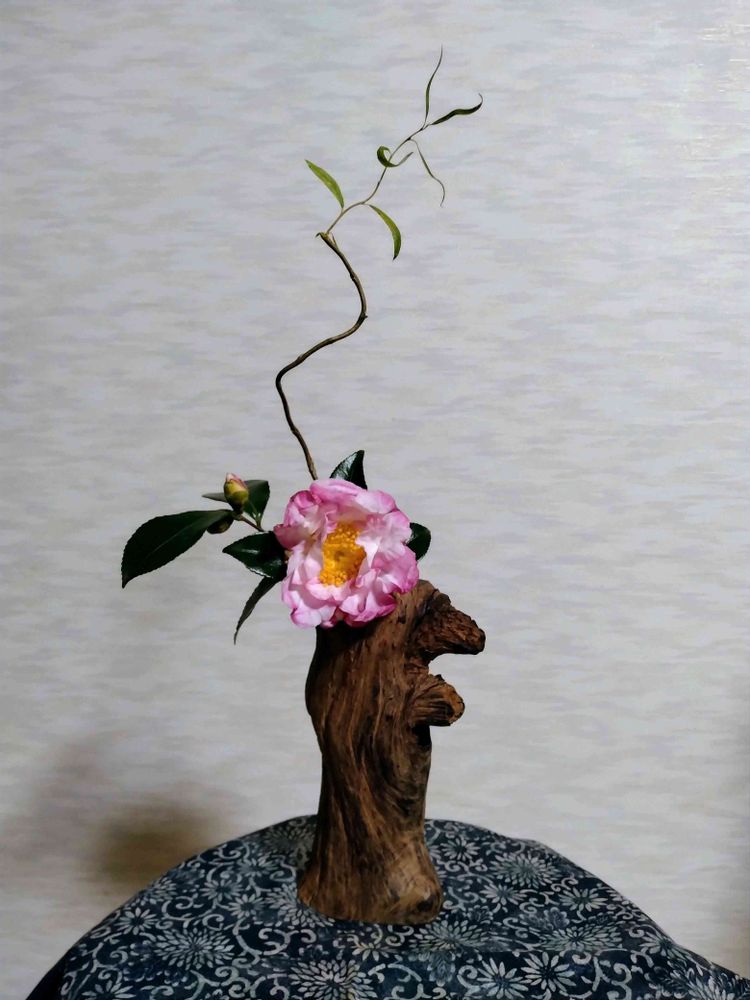 サザンカと雲竜柳、少ない花材で生けてみました。