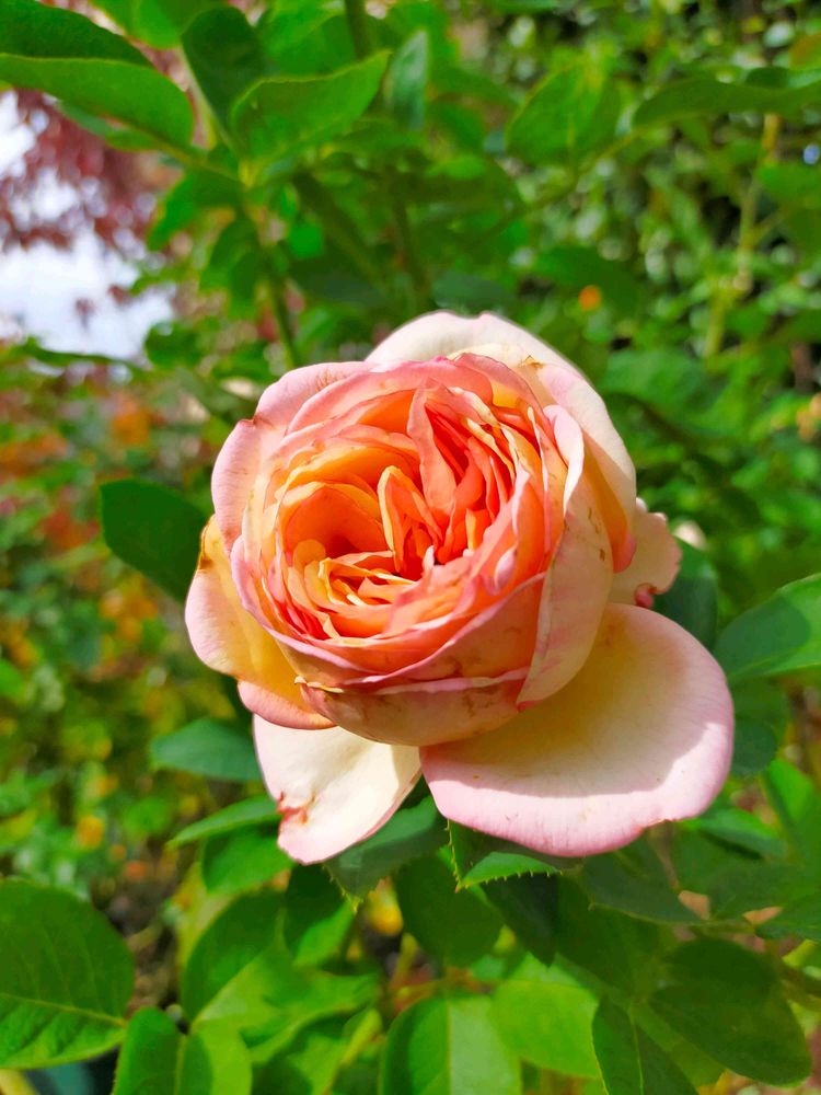 花弁数の多い白バラは雨で傷みやすく、キレイな姿で咲かすのが難しいのですが、色付きで難しいのは、このペッシュボンボンさん🌹ある程度大きな花で、花弁数が多いからでしょうか?雨に当たると、ボーリングもしやすいです。