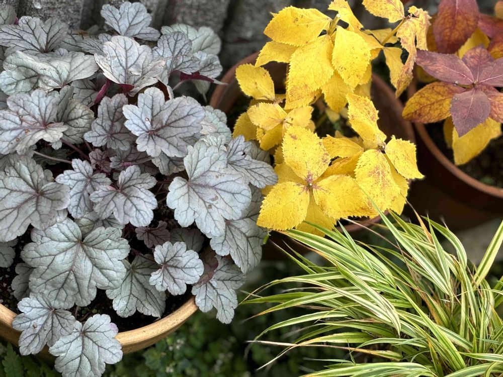 緑色の葉から、赤茶、そして黄色へと衣替えをしているような姿が、シルバーガムドロップと並んでいて🍂✨