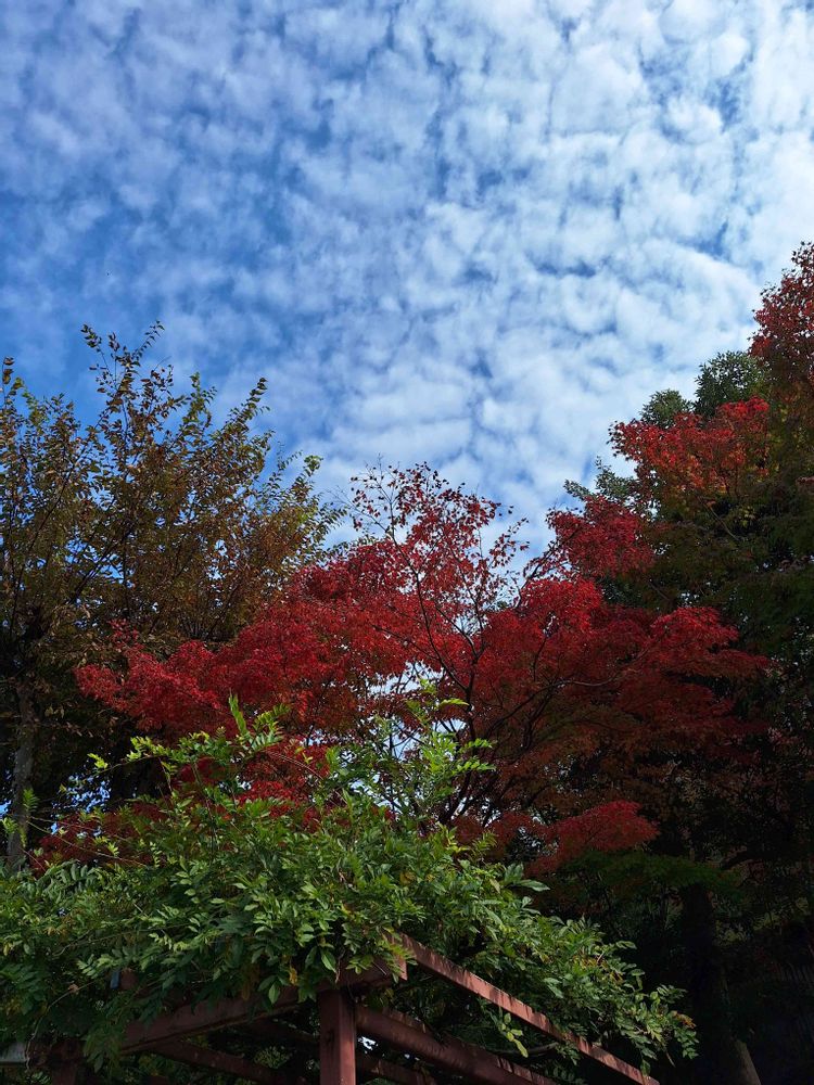藤棚に紅葉🍁青空💙白い雲☁️