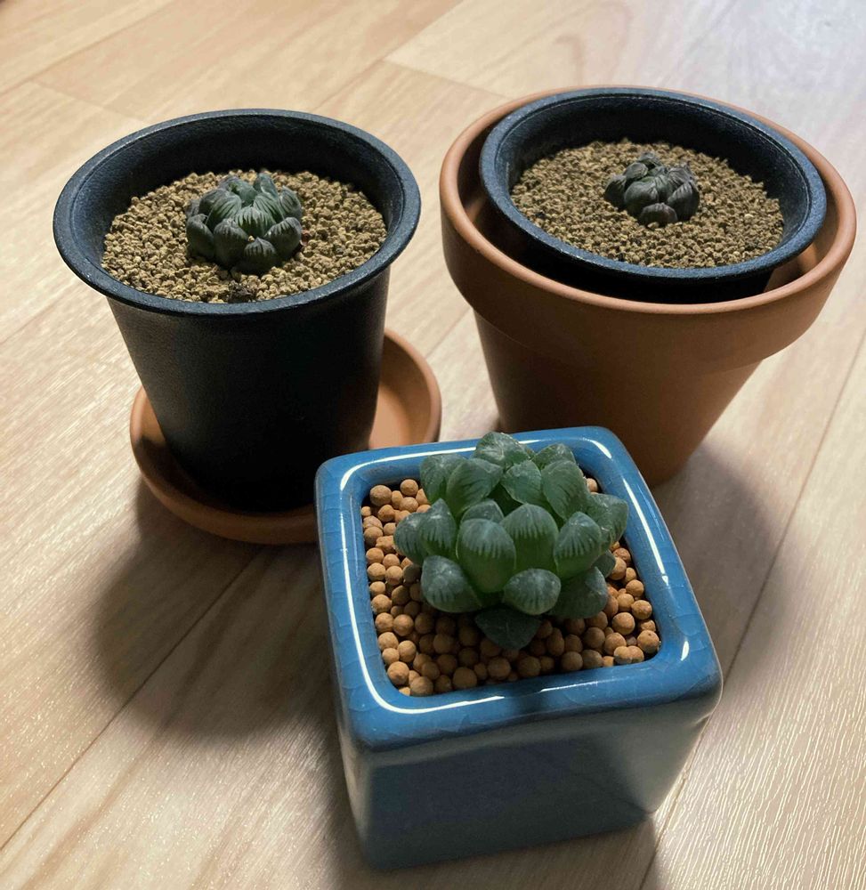 今日お迎えした子達、私が8月末に購入した青い鉢に入ってるトゥルンカータと一緒に入荷して店頭に並んでた子達だと思うのですが、(ハムスターや金魚用品買うのに頻繁にホムセンに足を運んでいて、時間の許す限り多肉さんも眺めていますが、トゥルンカータは私が購入してから今まで新しい子が来たのを見たことがない)、小さいし水不足で葉がシワシワだし、黒っぽくなっているしで、救ってあげたい気持ちが出てしまい、1週間ほど悩んだ末にお迎えしてきました。