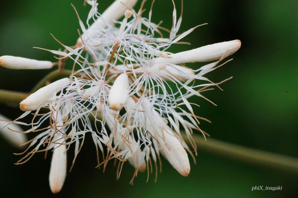 花の咲き始めに丁度出くわしました。白い糸が綺麗です。遠くから観ると雪が積もっているようにも見えます。盛んにハチが訪れていました。2018年6月24日,三重県いなべ市大安町,宇賀川河川敷にて。