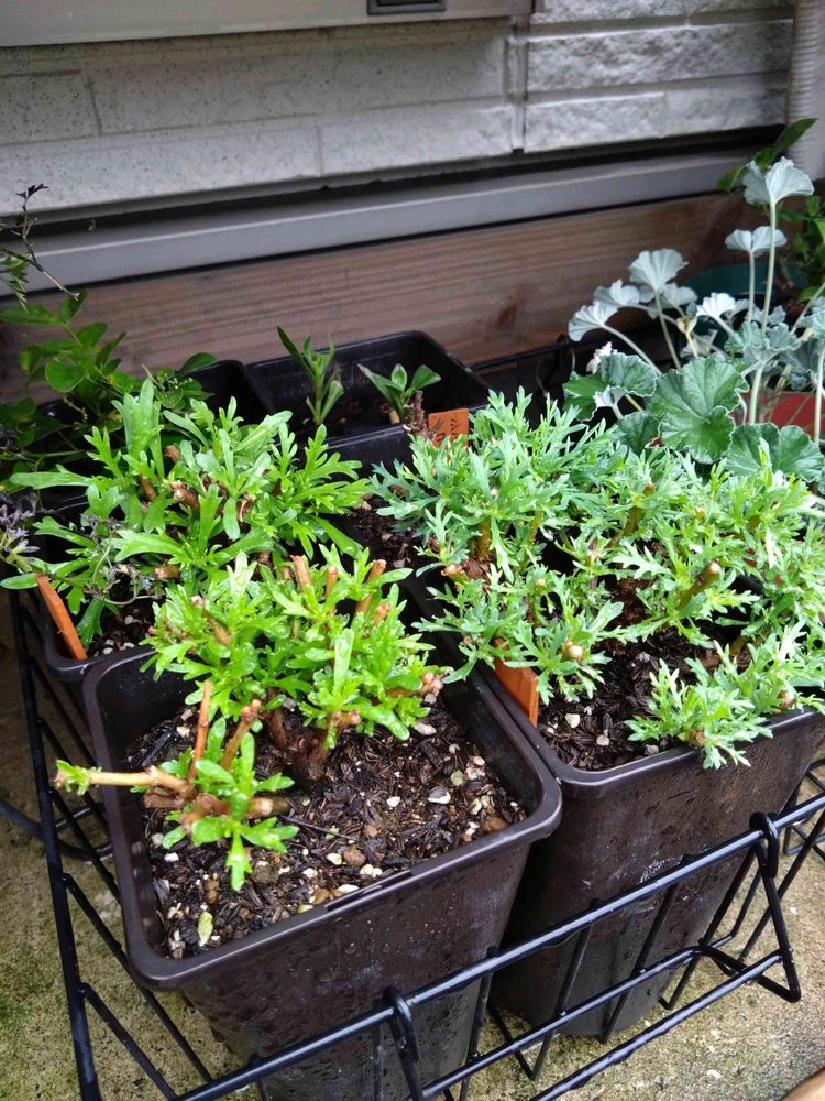 このオステオスペルマムとペラルゴニウムは挿し芽で、他にあと何ポットかと親株がそれぞれ2つずつあります。あとゼラニウムと、チョコレートコスモスの鉢と… 置き場所ない〜(泣)💦