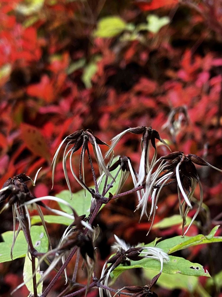 ドウダンツツジの赤をバックに、センニンソウのお髭