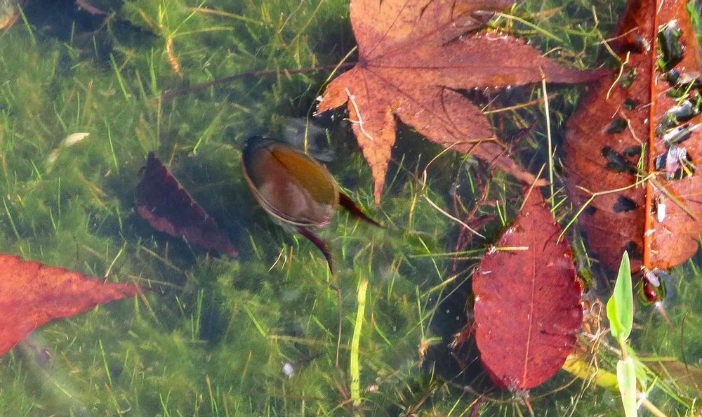 落葉浮かぶ池の中
