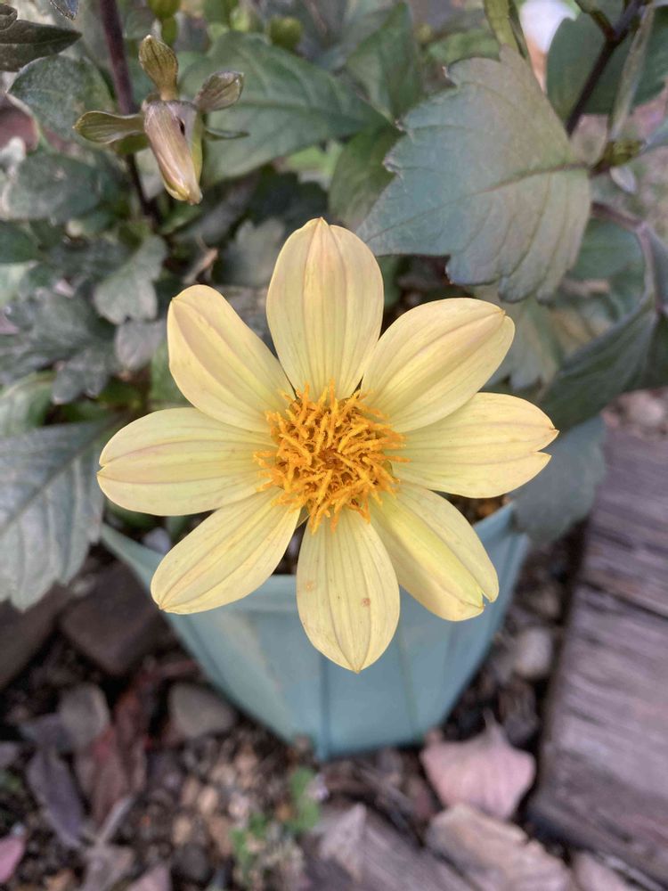 寄せ植えからスリット鉢にお1人様にしたら、バラのシュートのようにわき芽が伸びて花が咲きました🌼