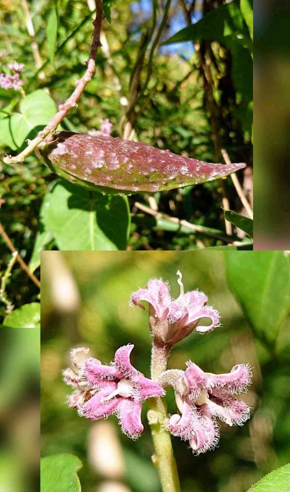 モフモフの紅紫色のガガイモの花がまだ綺麗に咲いていました、大きな実も色付き、今にも弾けてキラキラした綿毛が飛び出しそうです🟣💜🌿