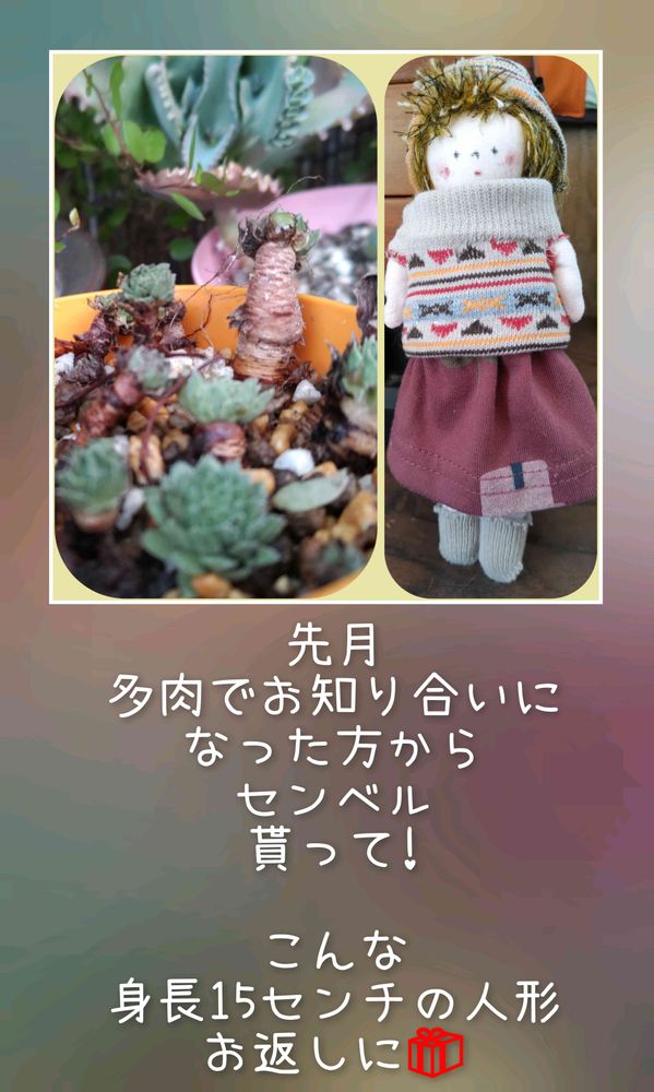 おはようございます😊センペルビウムのお返しにお人形さん♥センペルビウムはずっと外に放置していても大丈夫ですよ!寒さに強いので雪がかぶってもへっちゃらです!