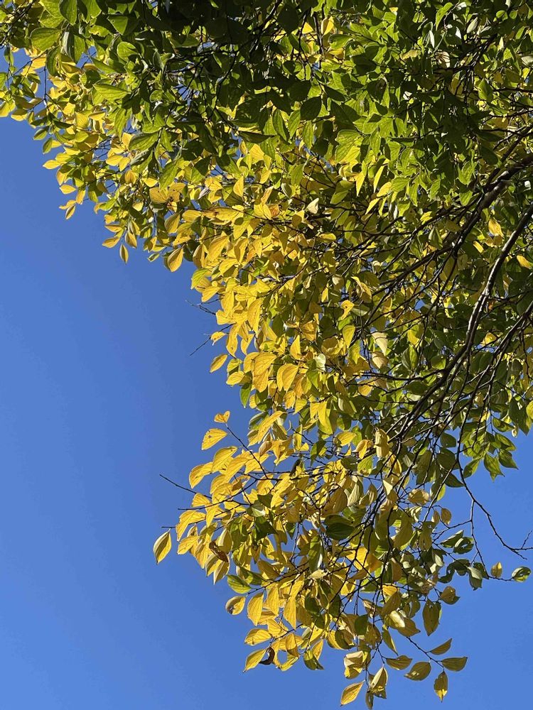 昨日の散歩途中、青空の中に鎮守の杜の一角が色付いて綺麗でした。😊💓