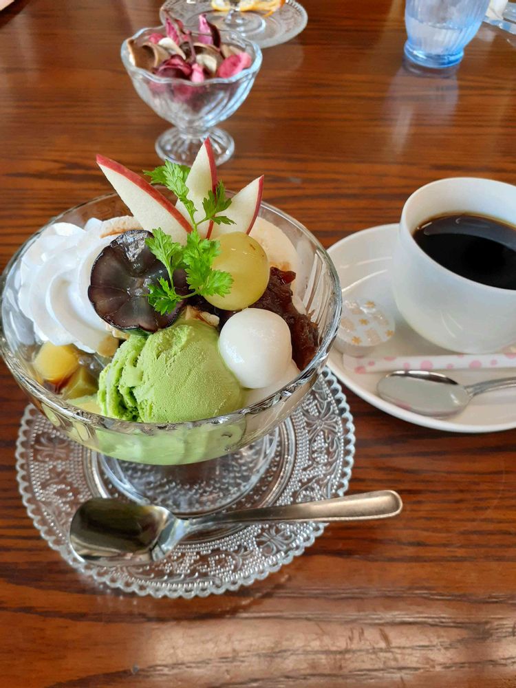 最後は古城荘のカフェで地元のフルーツが乗った白玉あんみつを頂きました
