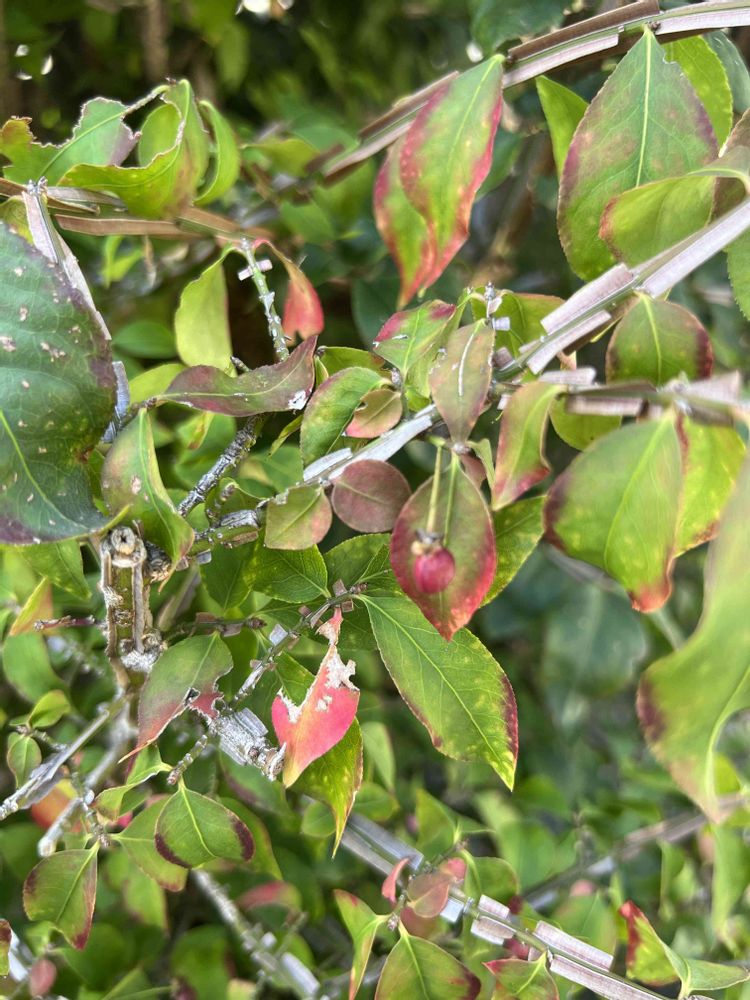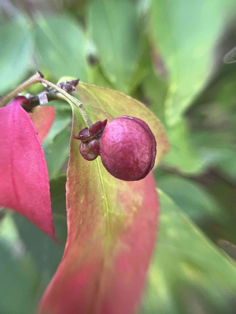 ニシキギが色づき始めました。赤い実もなってます。植えてから今まで実がなることに気づいていませんでした💦
