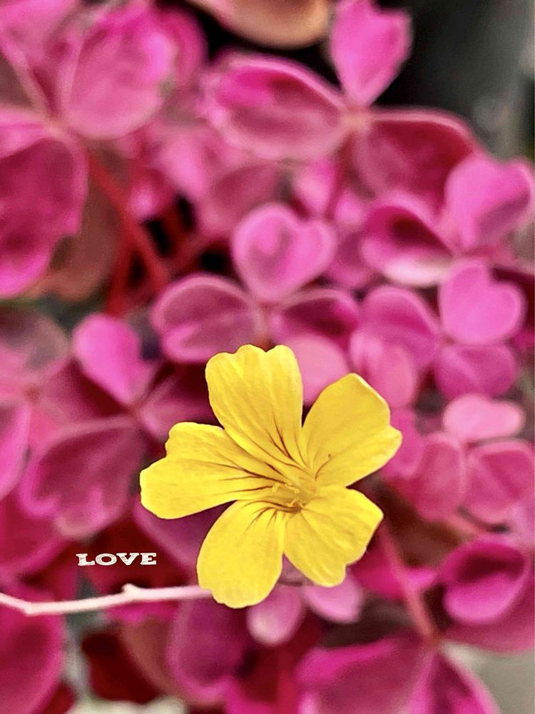 黄色のお花が咲くオキザリス・雅ちゃんの葉っぱは濃いピンクをしています🩷