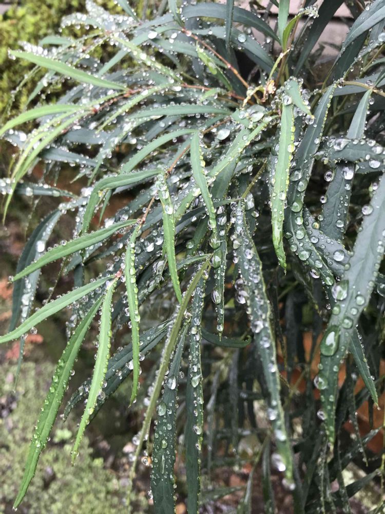 マホニアコンフューサーと南天の雨粒が素敵です。