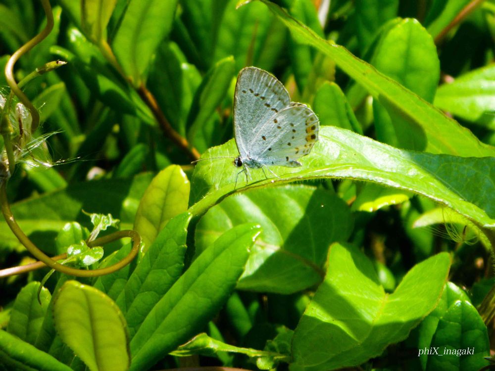 校庭の隅のイヌツゲの植え込みの上をヘクソカズラが這い回り,ほかにもチガヤなどが雑然と生えています。その葉っぱの上にちょこんとシジミチョウがとまりました。そーと,近づいて撮りました。