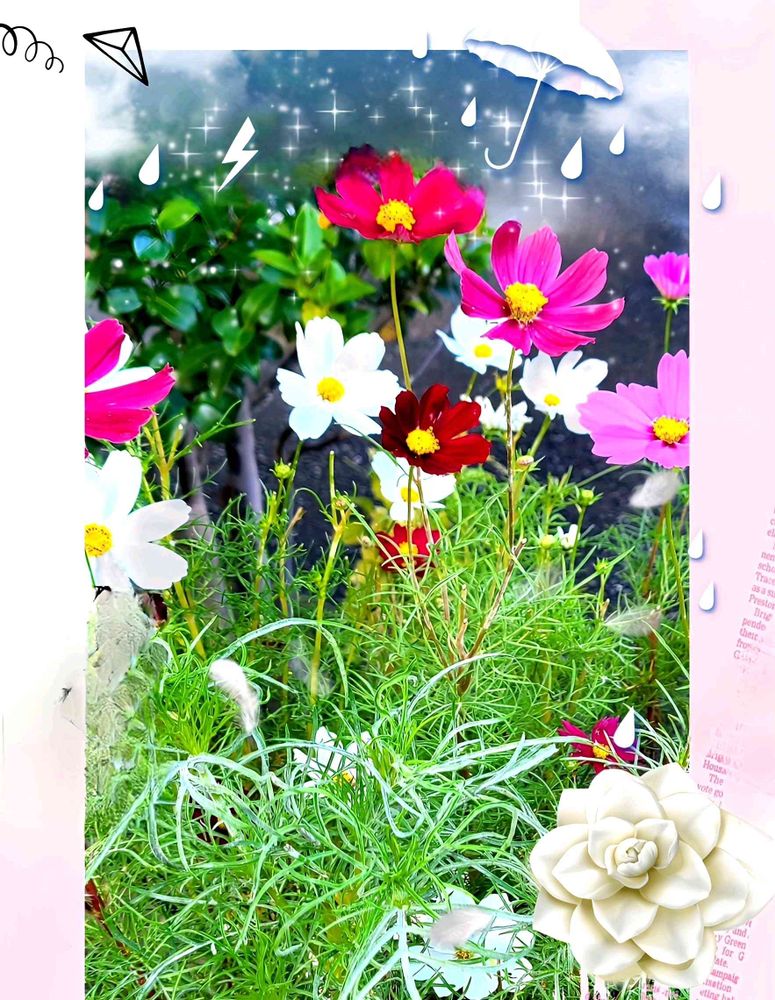 夕方から☔になってしまいました😃コスモスのお花のpicをどう表現しょうかと思いコラージュしてみました🤭
